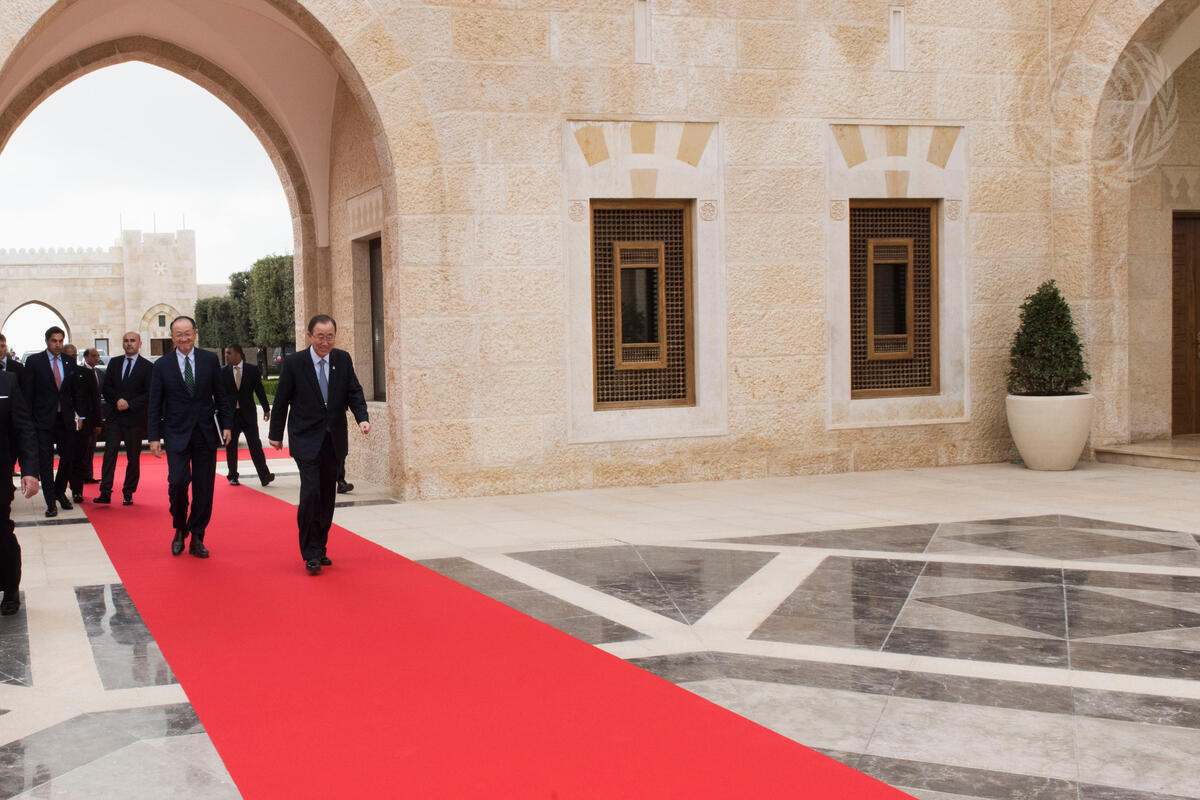 Secretary-General Ban Ki-moon (right) arrives at the Al Husseiniya Palace in Amman with World Bank President Jim Yong Kim (left) for a meeting with King Abdullah II ibn Al Hussein of the Hashemite Kingdom of Jordan.