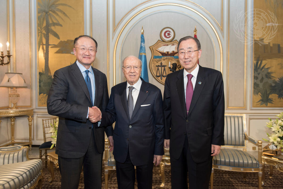 Secretary-General Ban Ki-moon (right) and Jim Yong Kim (left), President of the World Bank Group, meet with Béji Caïd Essebsi, President of Tunisia, in Tunis.