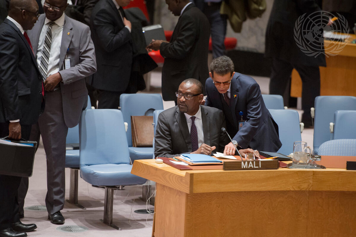 Abdoulaye Diop (seated), Minister for Foreign Affairs and International Cooperation of the Republic of Mali, with a member of his delegation at the Security Council meeting on the situation in Mali.
