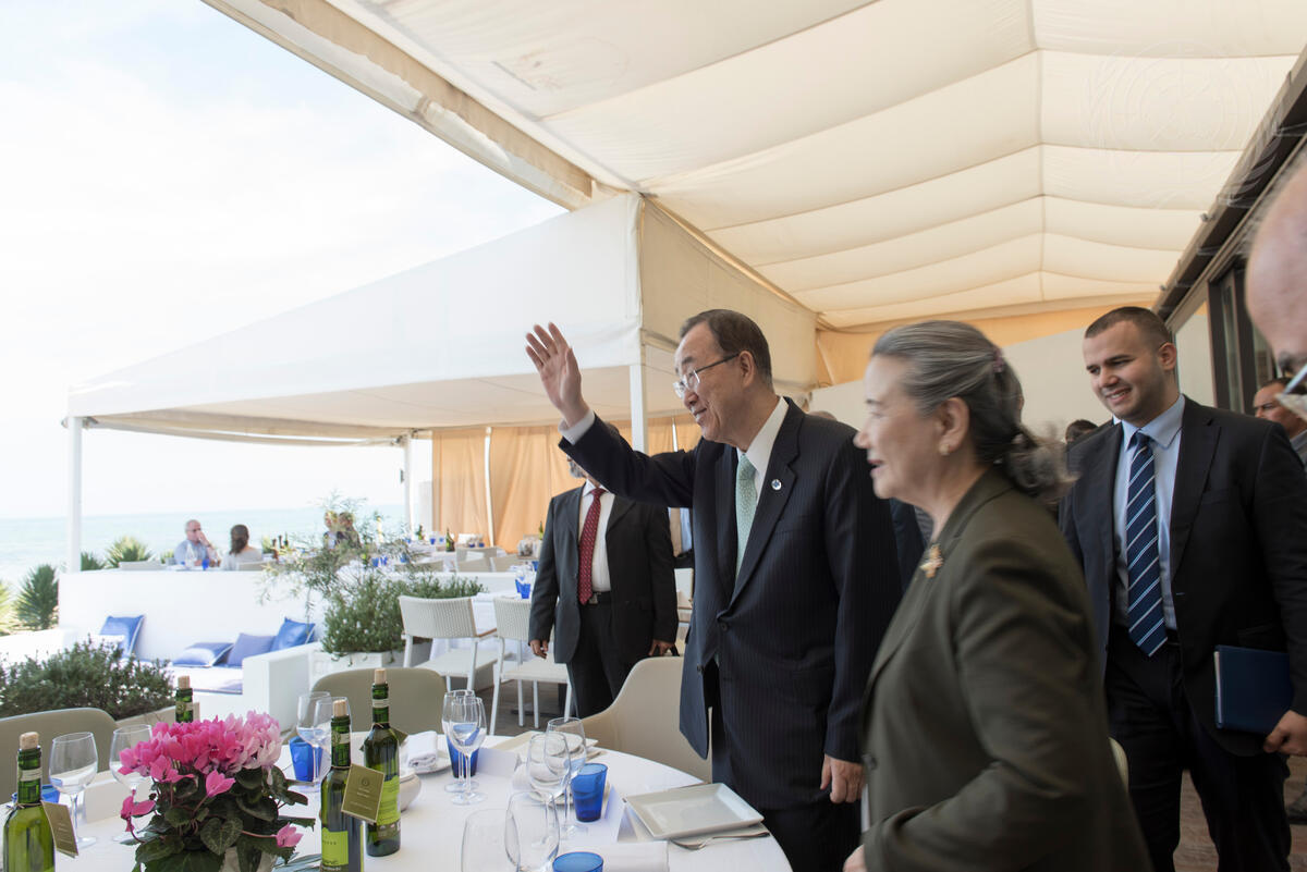 Secretary-General Ban Ki-moon, accompanied by his wife, Yoo Soon-taek, waves to bystanders in Tunis prior to his lunch meeting with representatives of the Tunisian National Dialogue Quartet.