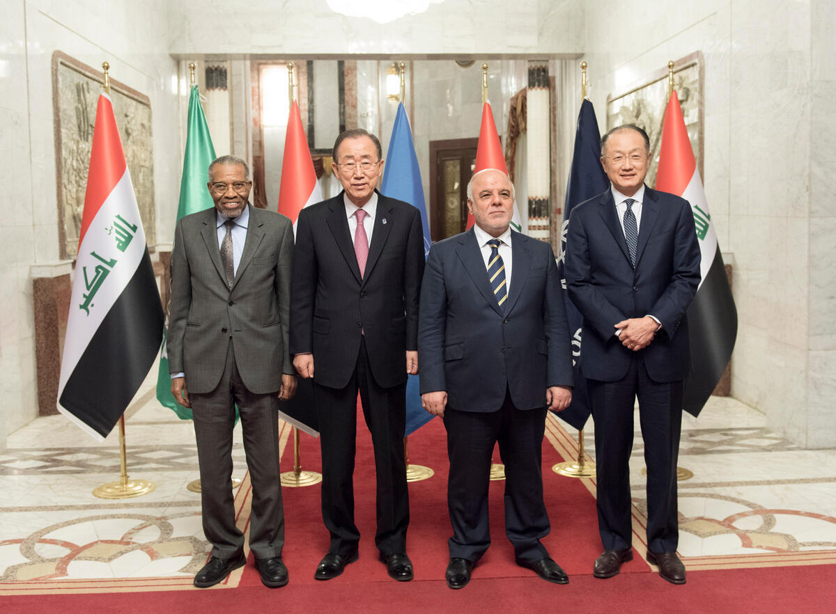 Secretary-General Ban Ki-moon (centre left) takes a group photo with Ahmad Mohamed Ali Al-Madani (left), President of the Islamic Development Bank, Haider al-Abadi (centre right), Prime Minister of Iraq, and Jim Yong Kim, President of the World Bank Group, following their meeting and joint press conference in Baghdad today.