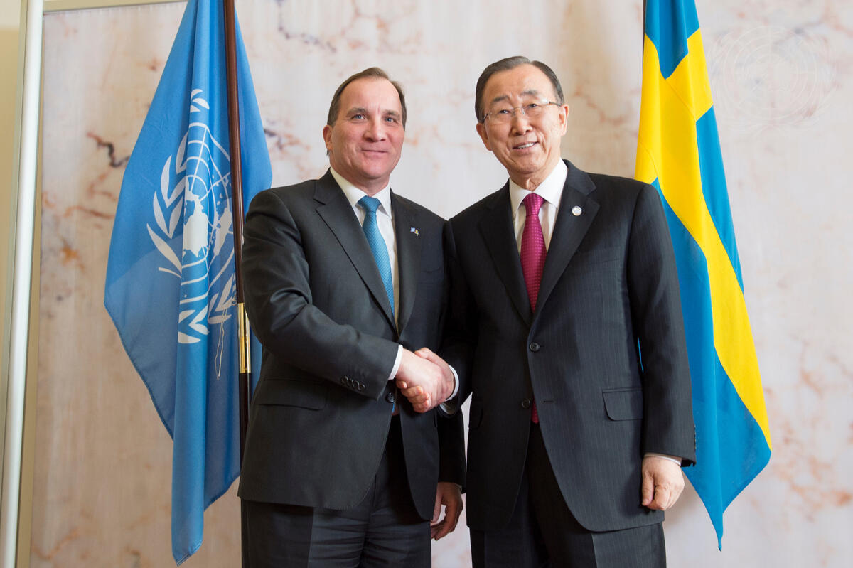 Secretary-General Ban Ki-moon (right) meets with Stefan Lo¨fven, Prime Minister of Sweden, in Stockholm.