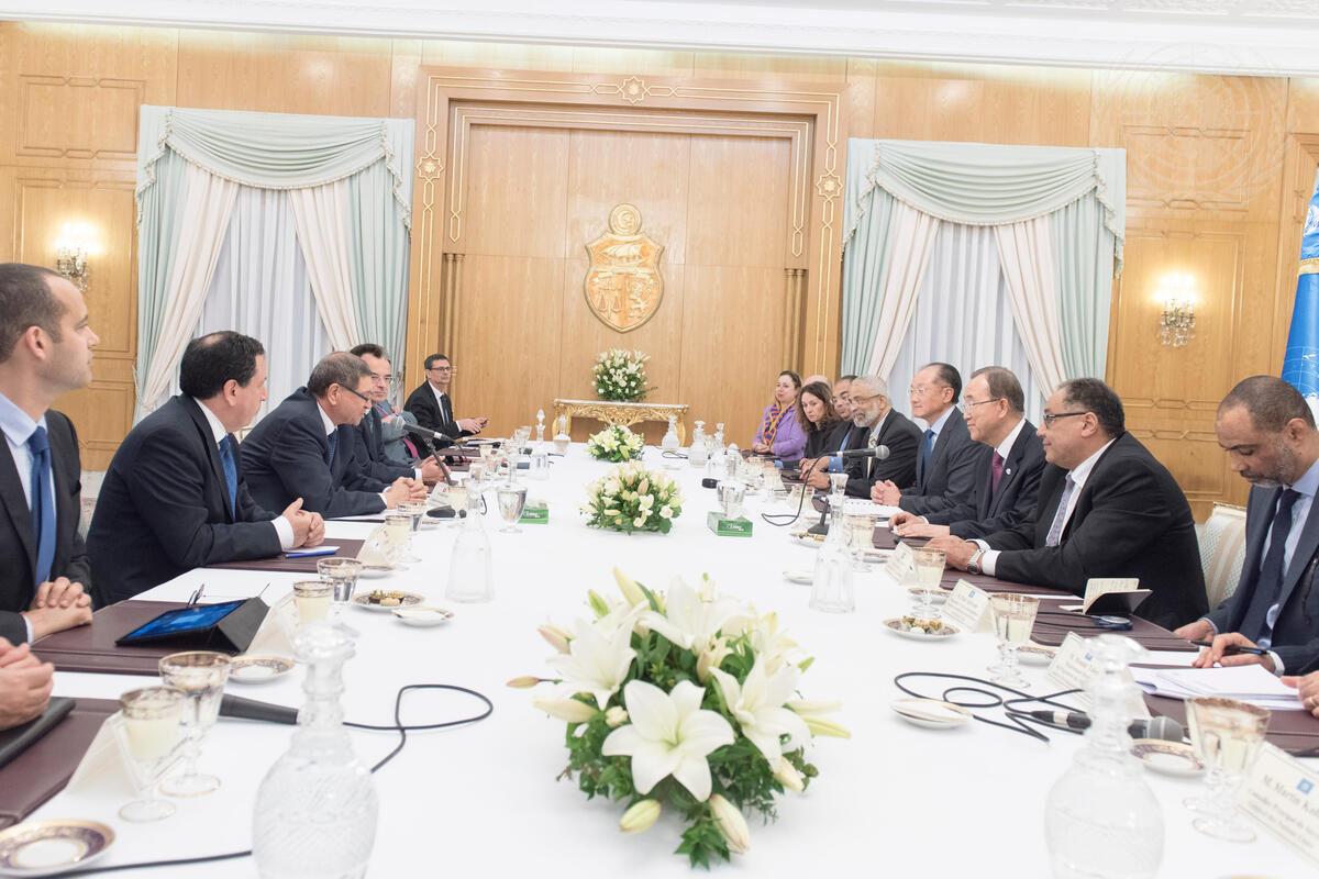 Secretary-General Ban Ki-moon (third from right) meets with Habib Essid (second from left), Head of Government of Tunisia, in Tunis. Pictured on Mr. Ban’s right is Jim Yong Kim, President of the World Bank Group.