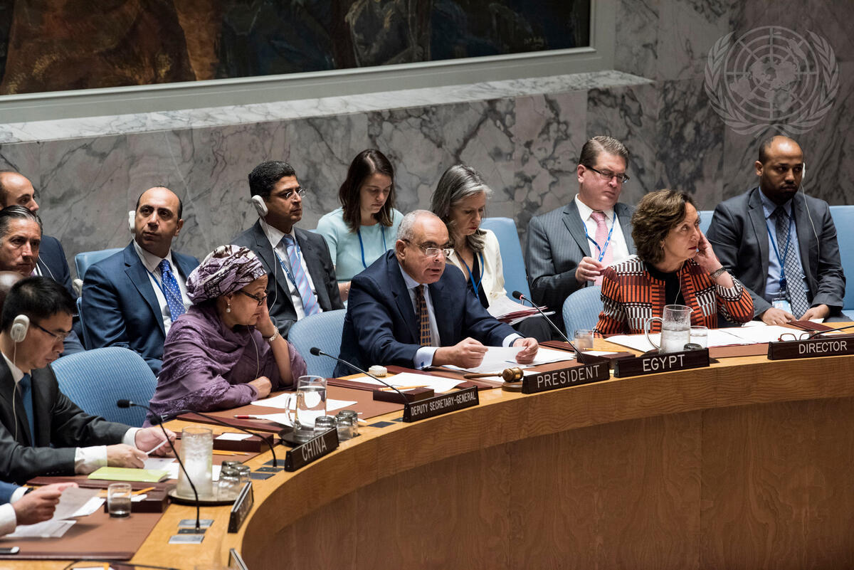Amr Abdel Latif Aboulatta, Permanent Representative of the Arab Republic of Egypt to the UN and President of the Security Council for August, chairs the Council's open debate on “United Nations peacekeeping operations: their potential contribution to the overarching goal of sustaining peace”. He is flanked by Deputy Secretary-General Amina Mohammed (left) and Hasmik Egian, Director of the Security Council Affairs Division, Department of Political Affairs.