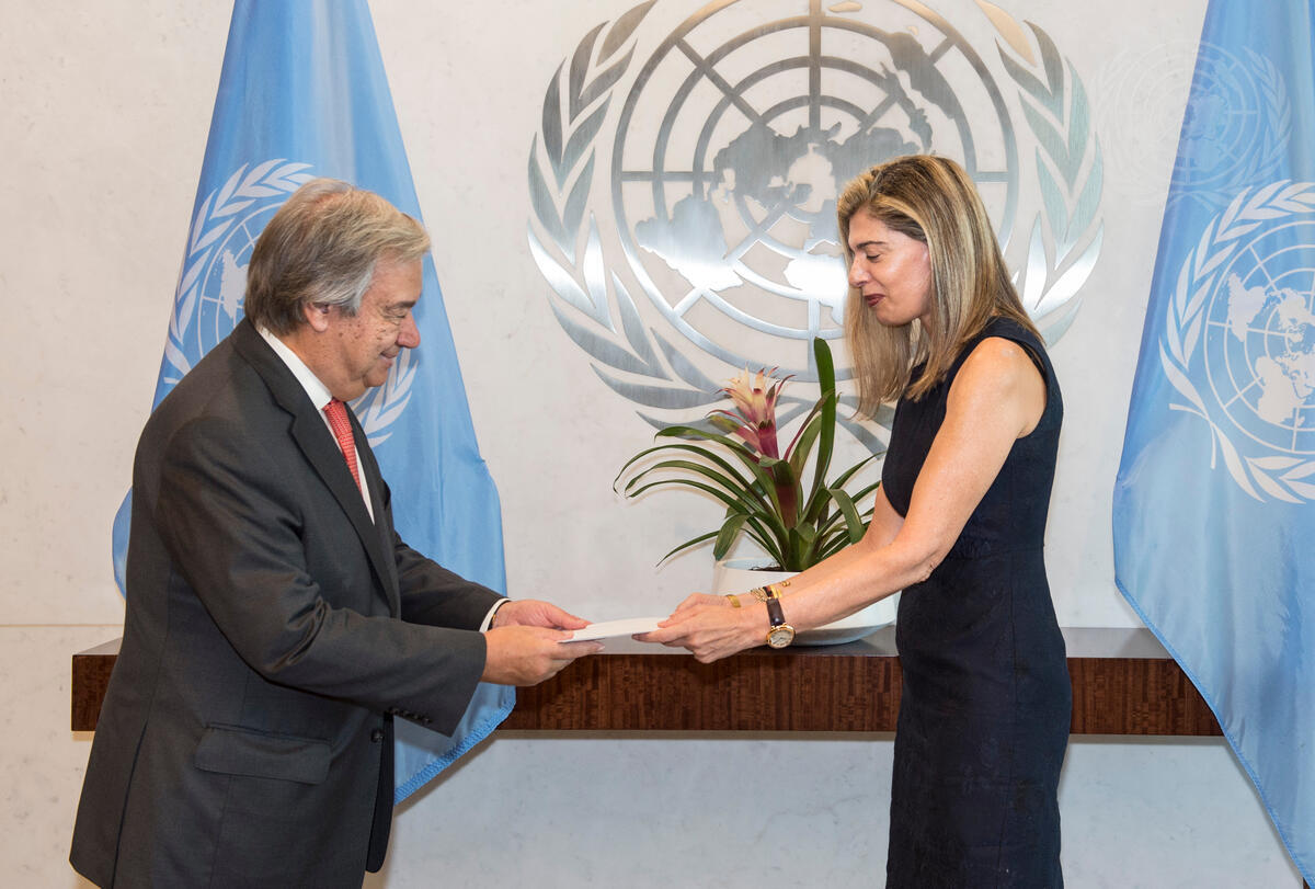 Maria Theofili (right), new Permanent Representative of Greece to the United Nations, presents her credentials to Secretary-General António Guterres.