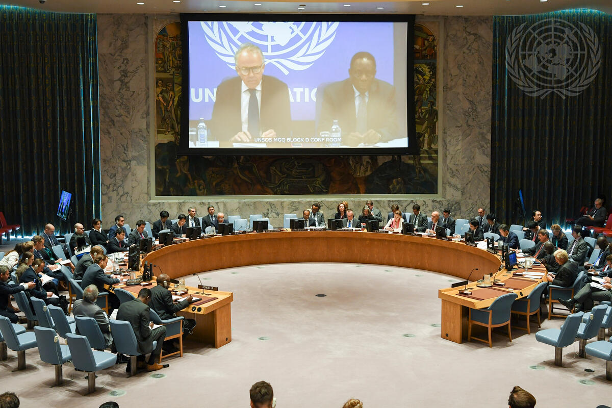 A wide view of the Security Council Chamber as Michael Keating (left on screen), Special Representative of the Secretary-General and Head of the United Nations Assistance Mission in Somalia (UNSOM), briefs the Council via video link.