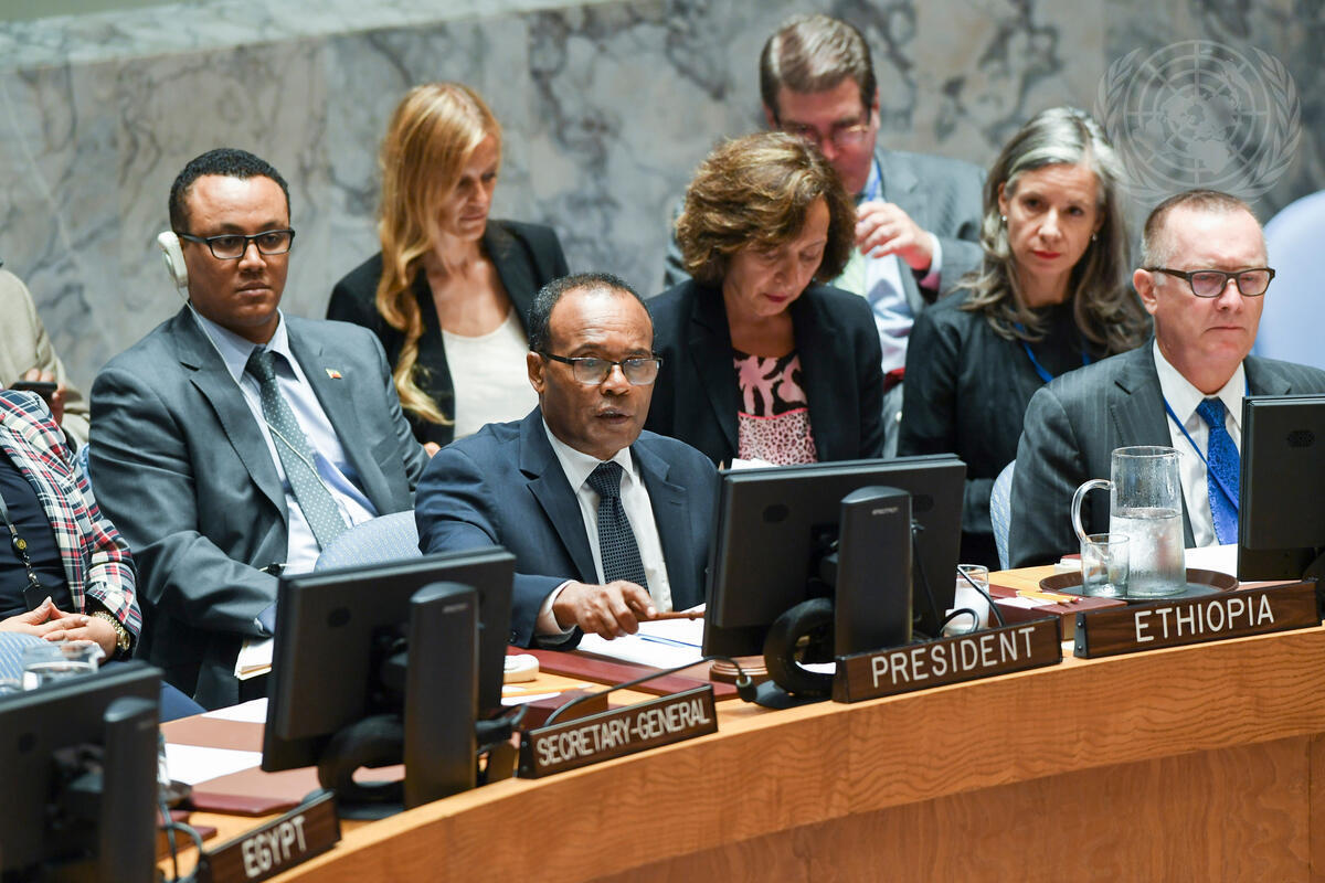 Tekeda Alemu (front left), Permanent Representative of the Federal Democratic Republic of Ethiopia to the UN and President of the Security Council for September, chairs the Council’s meeting on the situation in Somalia. At right is Jeffrey Feltman, Under-Secretary-General for Political Affairs.