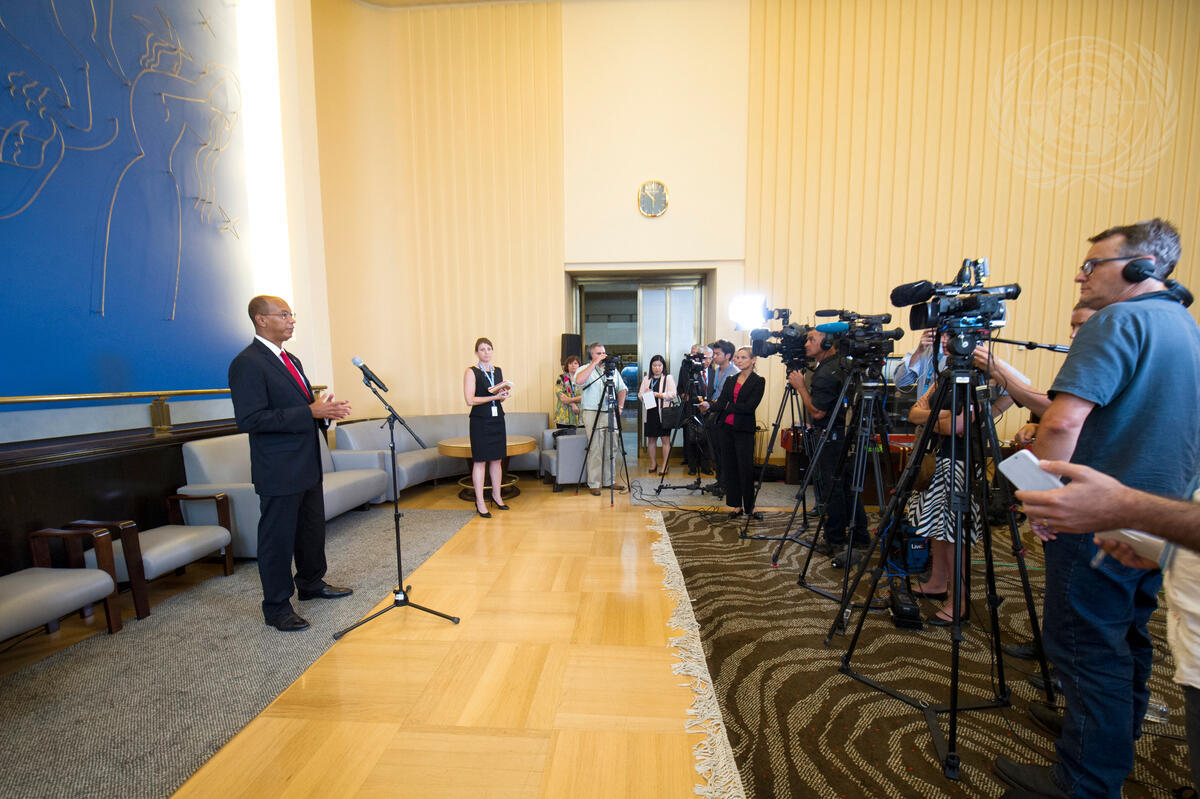 Robert Wood, Permanent Representative of the United States to the Conference on Disarmament, speaks to journalists on the nuclear and ballistic missile programmes of the Democratic People's Republic of Korea (DPRK).