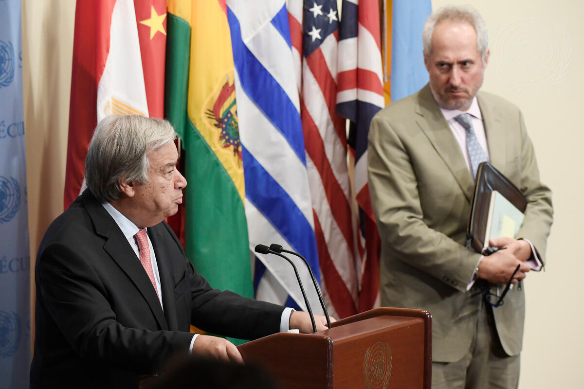 Secretary-General António Guterres (left) speaks to journalists at a press encounter. Also pictured, Stéphane Dujarric, Spokesman for the Secretary-General.
