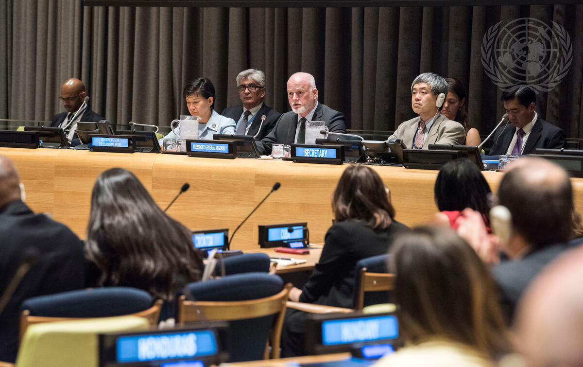 Peter Thomson (centre), President of the seventy-first session of the General Assembly, during the Assembly's meeting to mark the International Day against Nuclear Tests (29 August). He is flanked by Izumi Nakamitsu (left), UN High Representative for Disarmament Affairs; and Kenji Nakano, Chief of the General Assembly Affairs Branch, Department for General Assembly and Conference Management (DGACM).