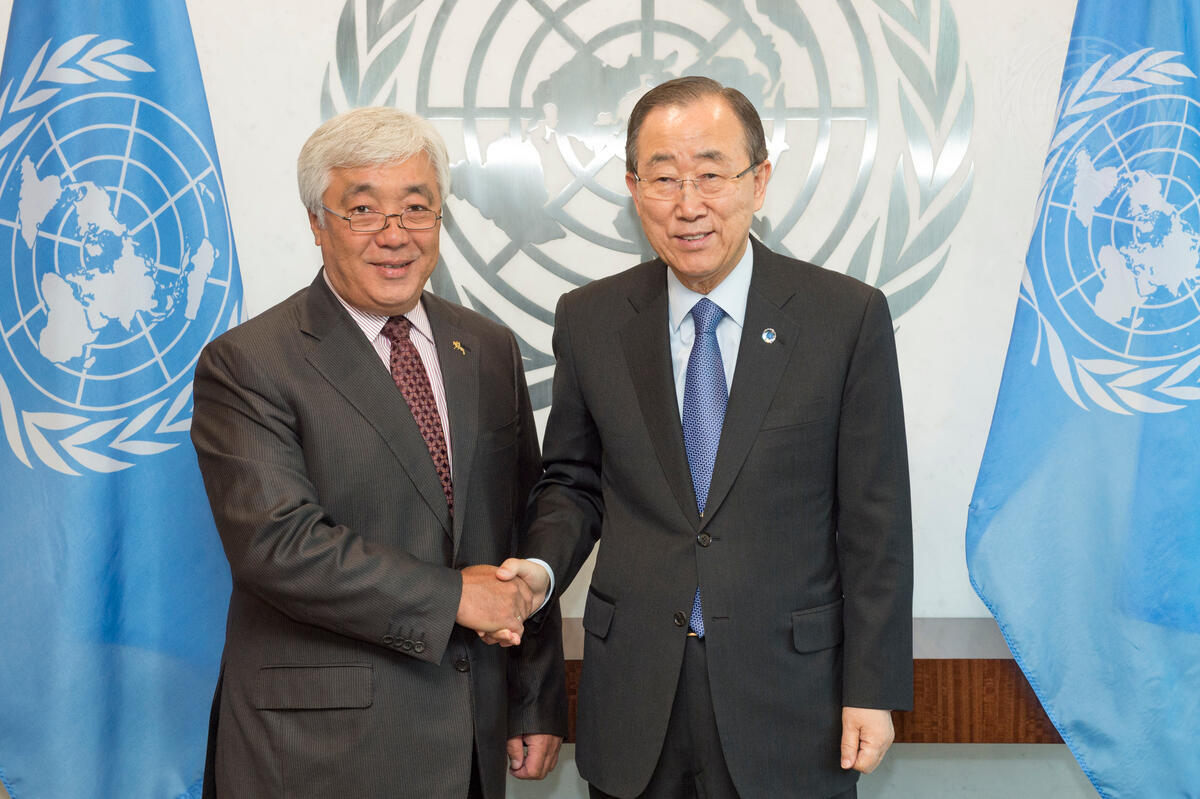 Secretary-General Ban Ki-moon (right) meets with Erlan Idrissov, Minister for Foreign Affairs of the Republic of Kazakhstan.