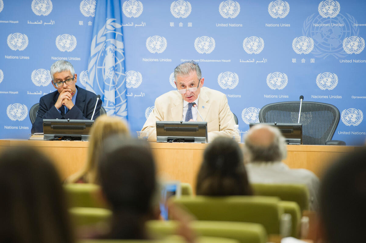 Jean-Paul Laborde (right), Executive Director of the UN Counter-Terrorism Committee Executive Directorate (CTED), briefs journalists on the flow of foreign terrorist fighters and recent terror attacks during today's daily press briefing at UN Headquarters in New York. On the left is Farhan Haq, Deputy Spokesman for the Secretary-General.