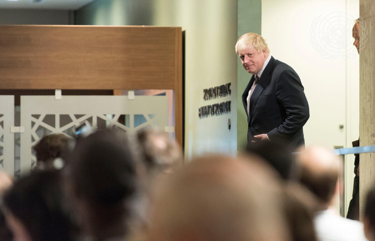 Boris Johnson, Secretary of State for Foreign and Commonwealth Affairs of the United Kingdom of Great Britain and Northern Ireland, arrives at the Security Council stakeout to brief the press following today's meeting on the situation in Libya.