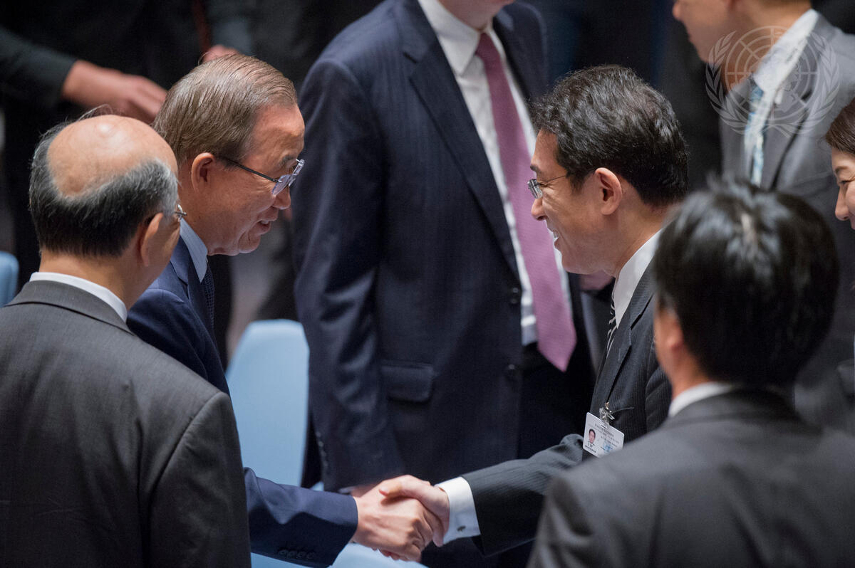 Secretary-General Ban Ki-moon (second from left) greets Fumio Kishida, Minister for Foreign Affairs of Japan and President of the Security Council for July, at the Council’s open debate on “Peacebuilding in Africa”. Also pictured, Koro Bessho (left, back to camera), Permanent Representative of Japan to the UN.