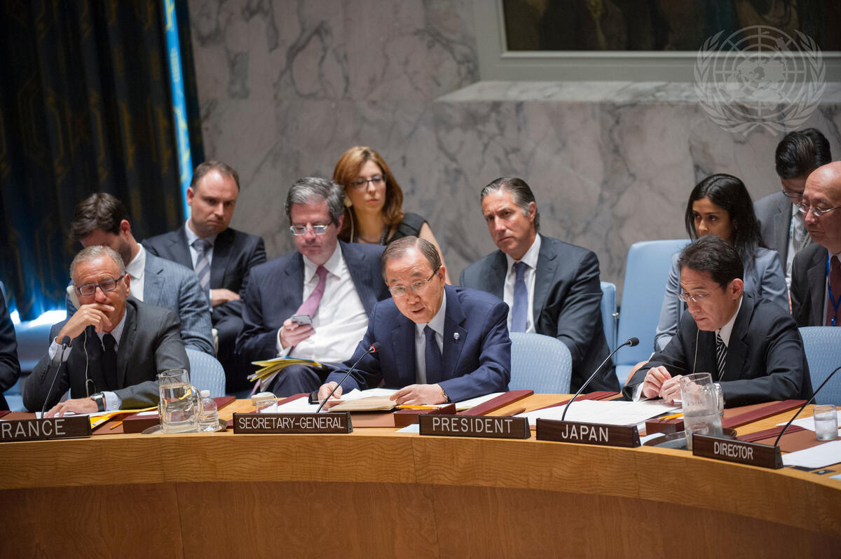 Secretary-General Ban Ki-moon (front centre) addresses the Security Council open debate on “Peacebuilding in Africa”. He is flanked by André Vallini (left), Minister of State for Development and Francophonie of France; and Fumio Kishida, Minister for Foreign Affairs of Japan and President of the Security Council for July.
