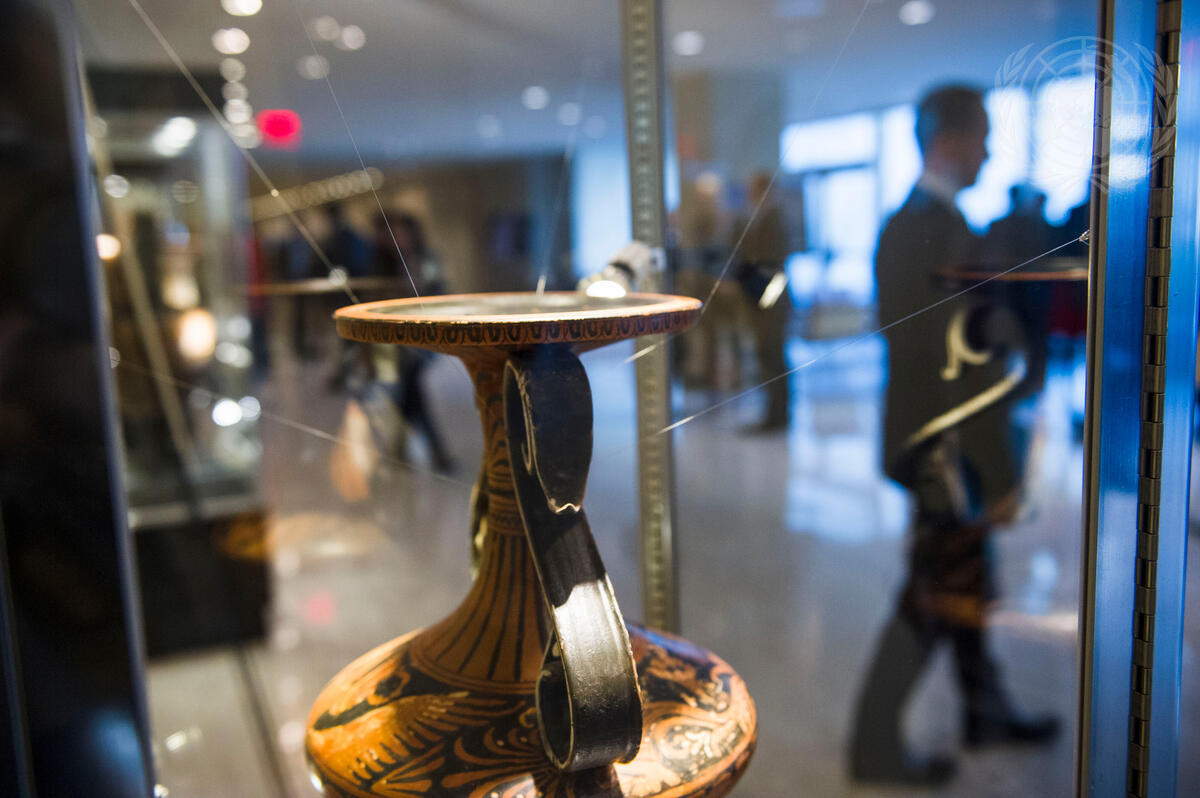 A close-up of one of the artifacts displayed at the opening of the exhibit entitled ""Protecting Cultural Heritage: An Imperative for Humanity"". The exhibit was co-organized by the Permanent Missions of Italy and the Hashemite Kingdom of Jordan to the United Nations in collaboration with the UN Educational, Scientific and Cultural Organization (UNESCO), the UN Office on Drugs and Crime (UNODC), and the International Criminal Police Organization (Interpol).