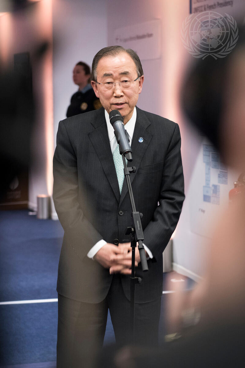 Secretary General Ban Ki-moon addresses the press at the UN Climate Change Conference in Paris (COP21).