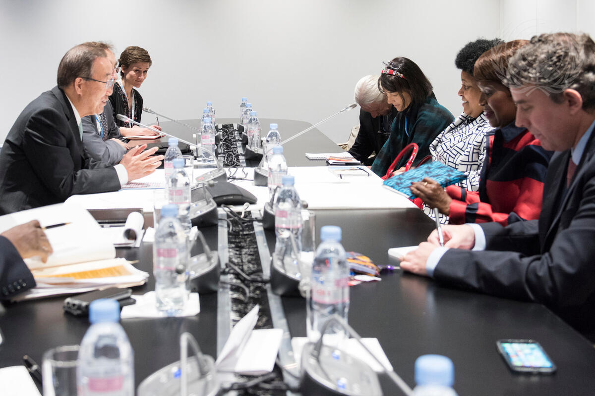 Secretary-General Ban Ki-moon (left) meets with Edna Molewa (third from right), Minister for Environmental Affairs of South Africa, on the margins of the UN Climate Change Conference in Paris, France (COP21), taking place from 30 November - 11 December.