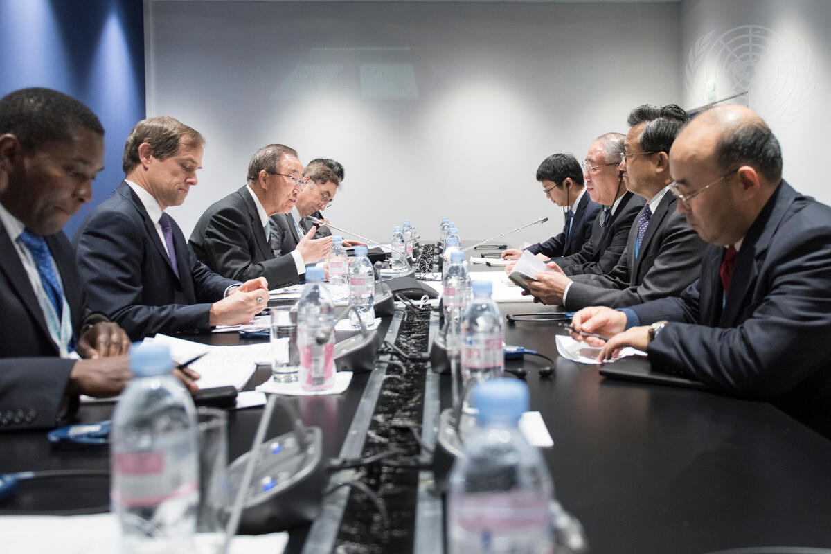 Secretary-General Ban Ki-moon (third from left) meets with Xie Zhenhua (third from right), Special Representative on Climate Change of the People’s Republic of China, on the margins of the UN Climate Change Conference in Paris, France (COP21), taking place from 30 November - 11 December.