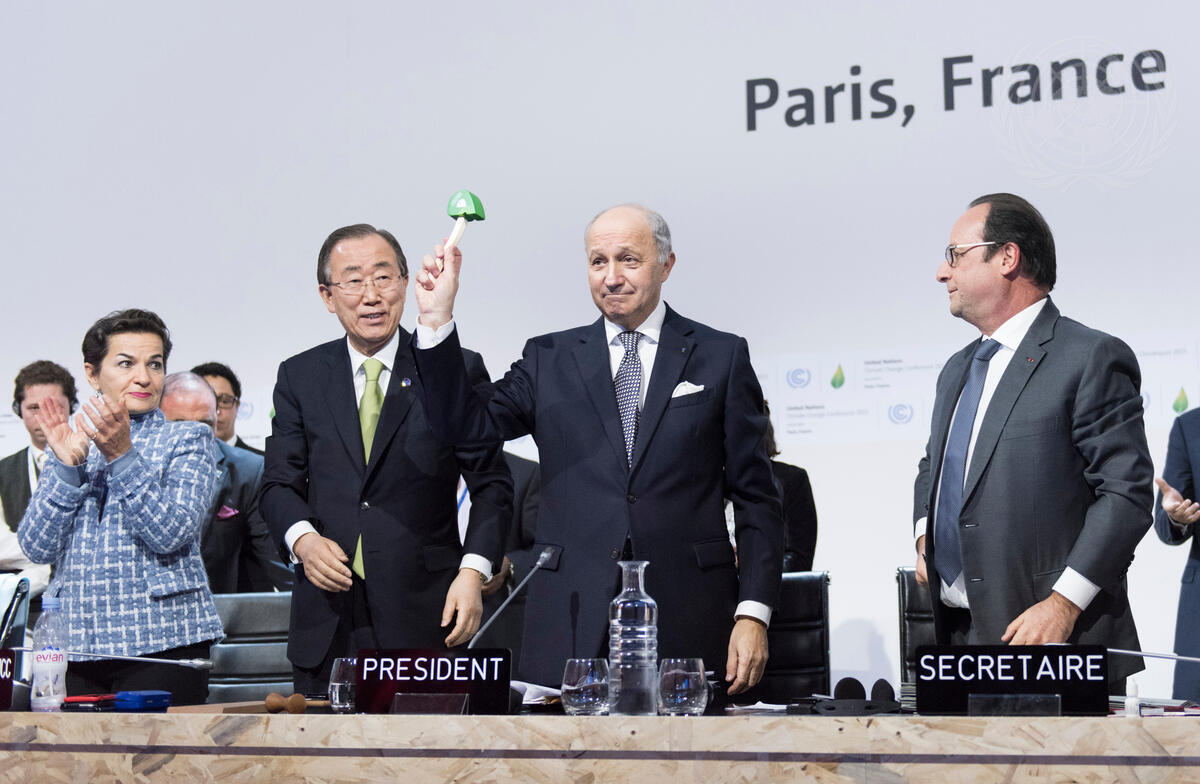 Secretary-General Ban Ki-moon (second left); Christiana Figueres (left), Executive Secretary of the UN Framework Convention on Climate Change (UNFCCC); Laurent Fabius (second right), Minister for Foreign Affairs of France and President of the UN Climate Change Conference in Paris (COP21) and François Hollande (right), President of France celebrate after the historic adoption of Paris Agreement on climate change.