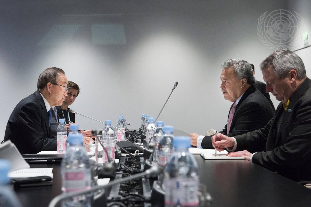 Secretary-General Ban Ki-moon (left) meets with Enele Sosene Sopoaga (second from right), Prime Minister of Tuvalu, on the margins of the UN Climate Change Conference in Paris (COP21).