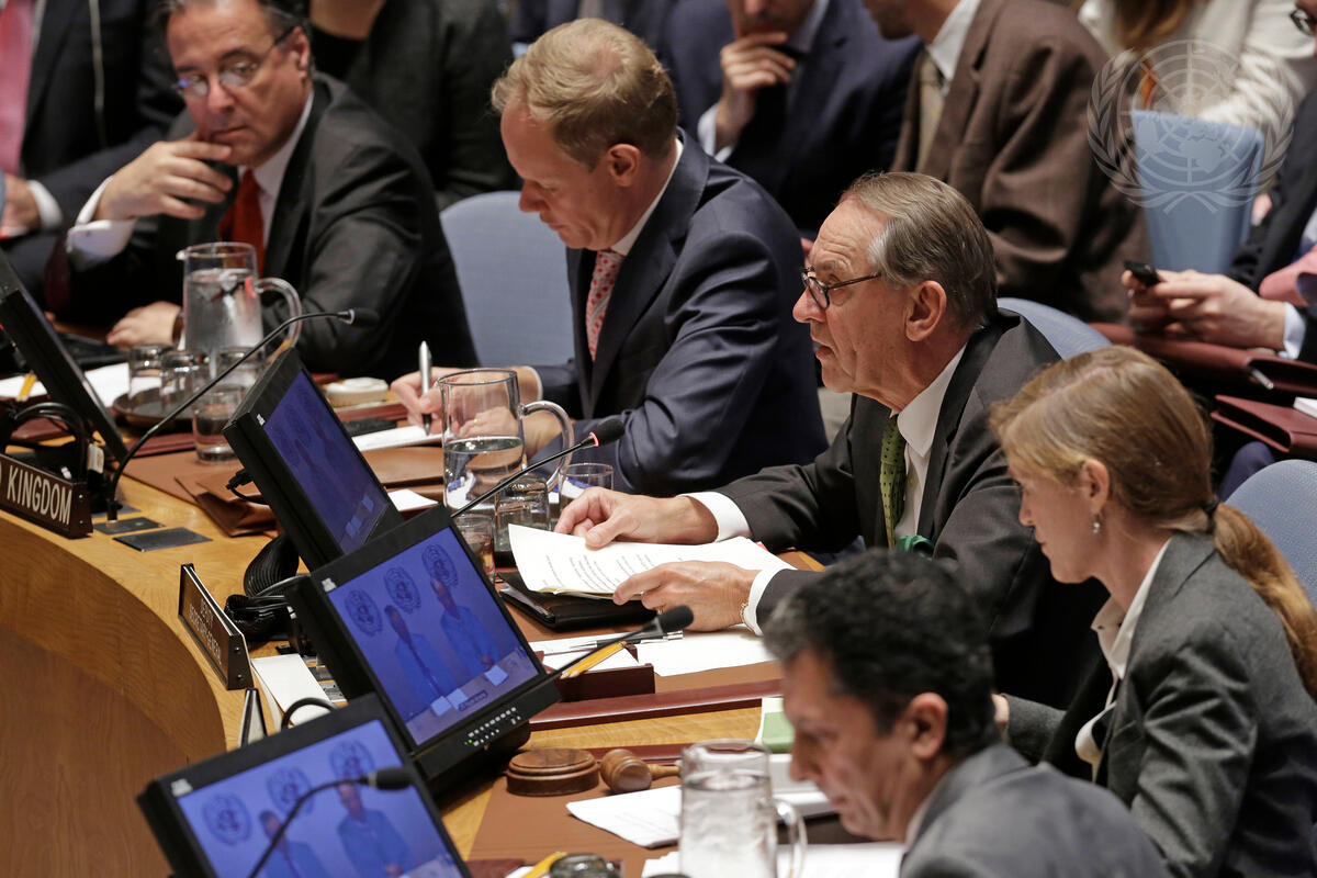 A side view of Deputy Secretary-General Jan Eliasson (centre) as he addresses the Security Council meeting on the situation in Ukraine.