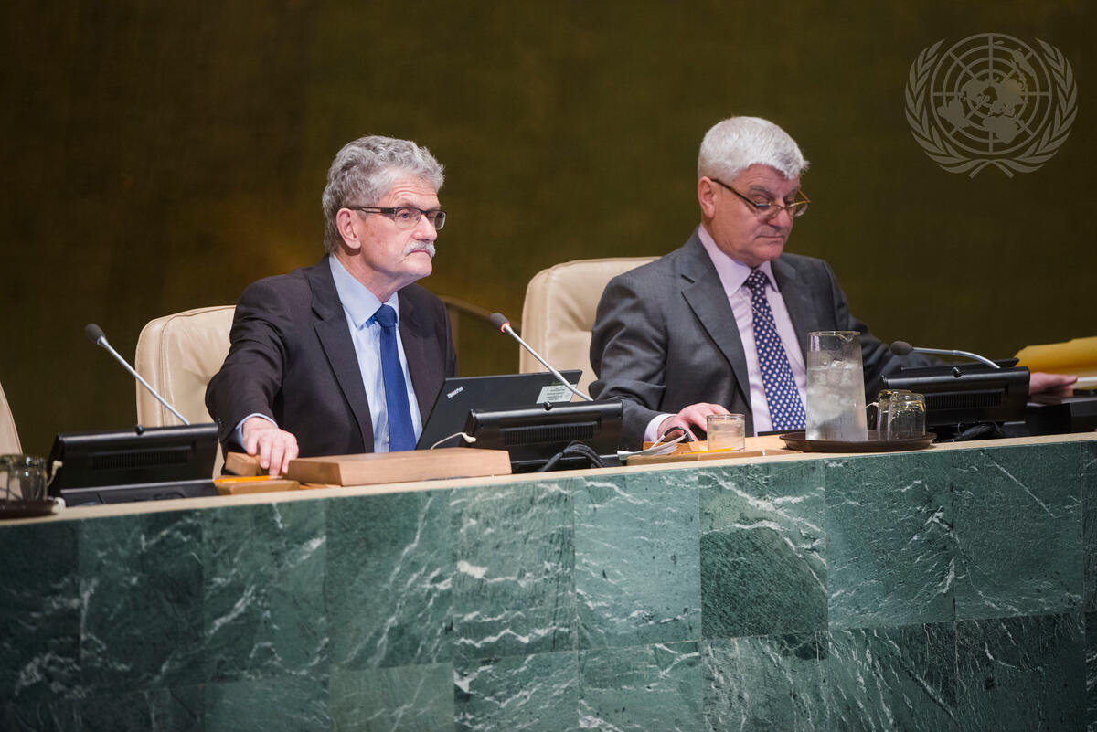 Mogens Lykketoft (left), President of the seventieth session of the General Assembly, chairs the meeting. At his side is Ion Botnaru, Director of the General Assembly and Economic and Social Council (ECOSOC) Affairs Division.