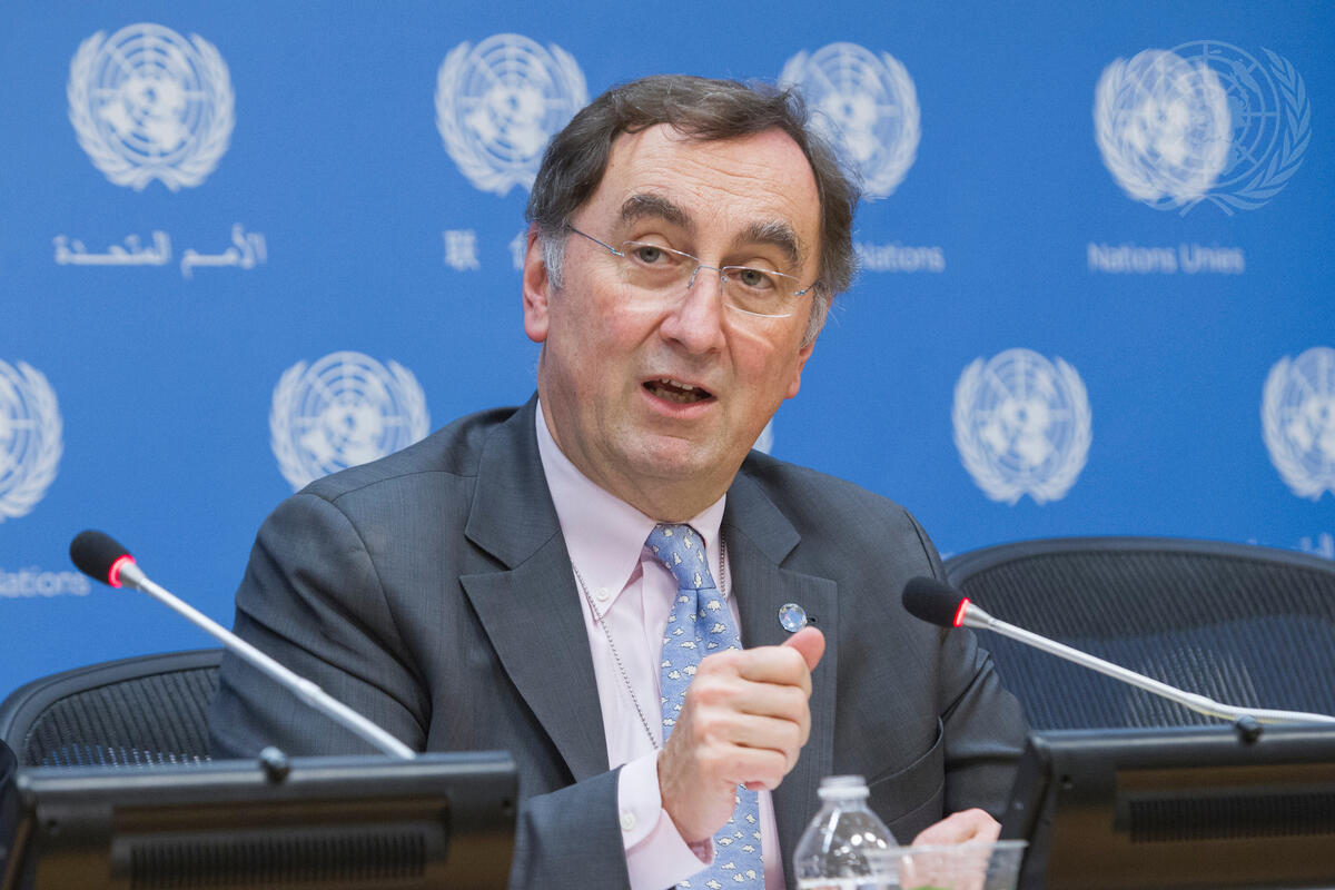 Janos Pasztor, Assistant Secretary-General and Senior Adviser of the Secretary-General on Climate Change, addresses a press conference on the historic Paris Agreement adopted on 12 December by the UN Climate Change Conference in that city (COP21).