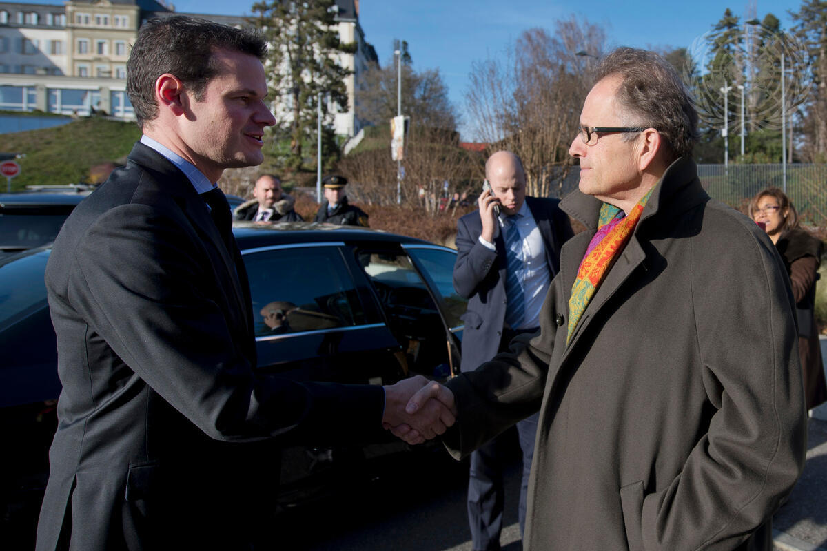 Michael Møller (right), Director-General of the UN Office at Geneva (UNOG), meets with Pierre Maudet, State Councillor in charge of the Department of Security, Police and the Economy of Geneva.