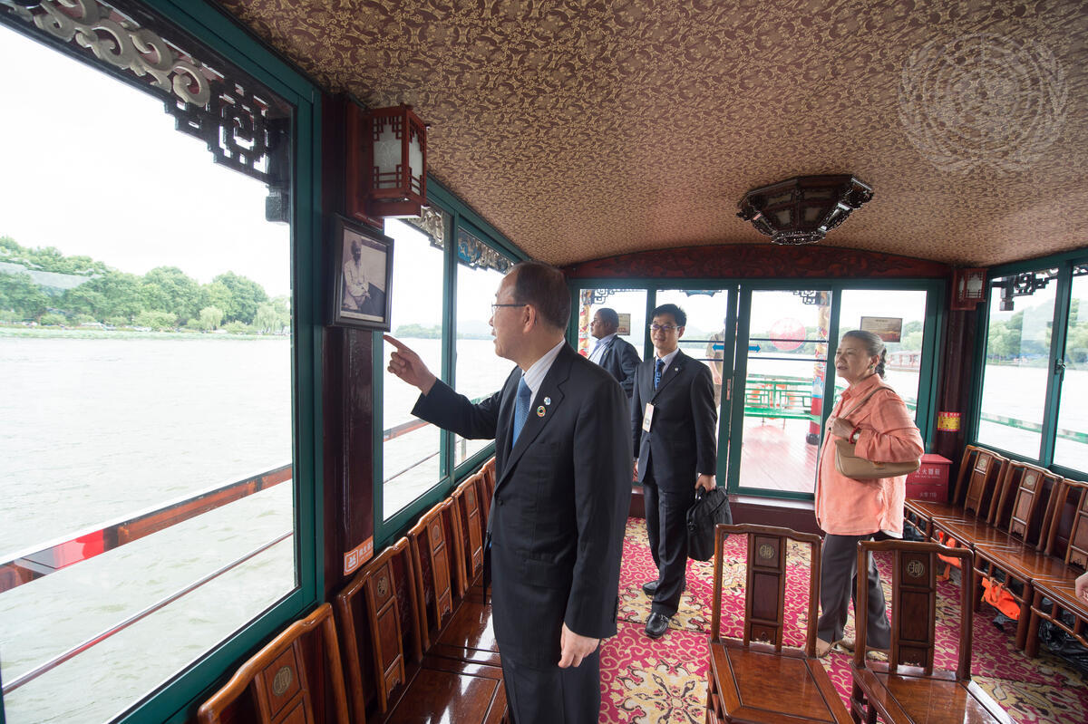 Secretary-General Ban Ki-moon (left) and his wife, Yoo Soon-taek (right), visit West Lake in Hangzhou, China.
