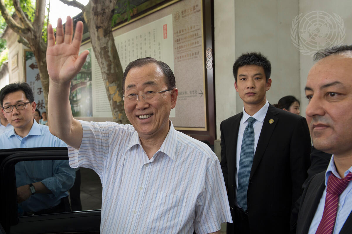 Secretary-General Ban Ki-moon waves to tourists during his visit to the Humble Administrator's Garden (Zhuozheng Yuan) in Suzhou, Jiangsu Province, China.