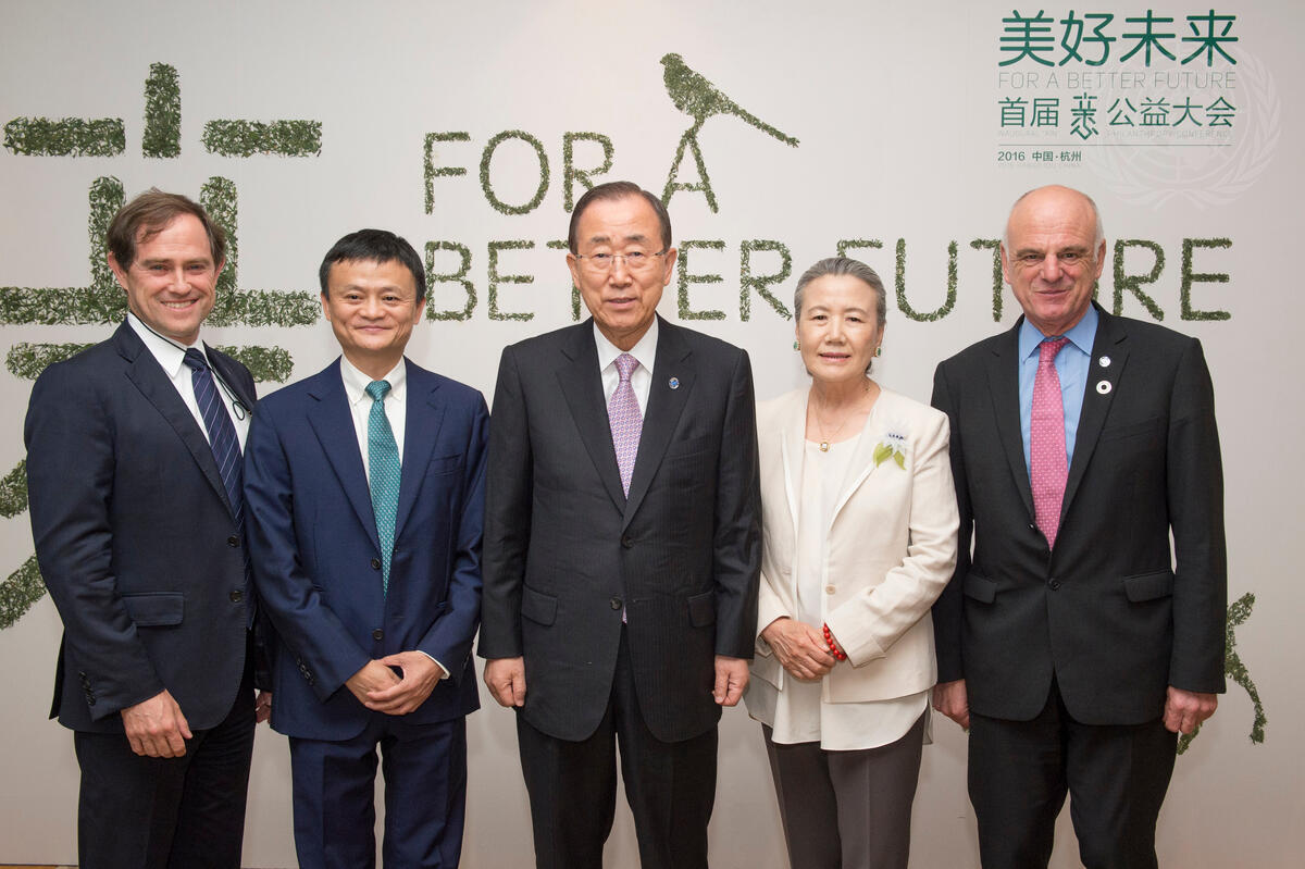 Secretary-General Ban Ki-moon (centre) and his wife, Yoo Soon-taek (second from right), pose for a photograph with Jack Ma (second from left), founder and Executive Chairman of the Chinese company Alibaba Group Holding Ltd in Hangzhou, China.