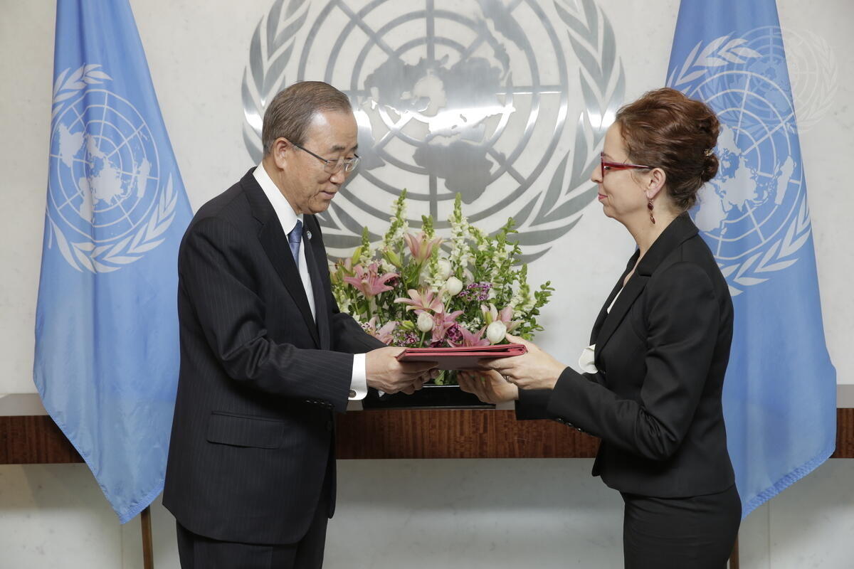 Besiana Kadare (right), new Permanent Representative of the Republic of Albania to the United Nations, presents her credentials to Secretary-General Ban Ki-moon.
