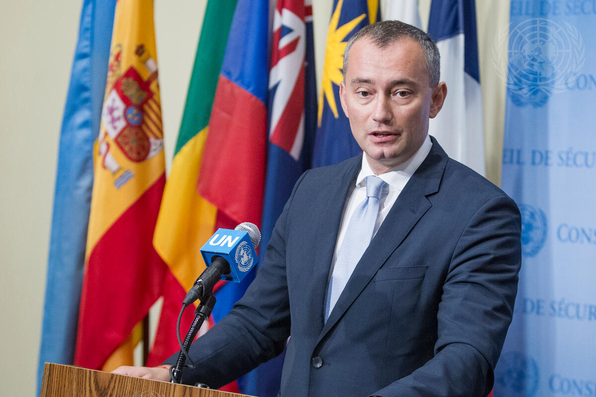 Nickolay Mladenov, UN Special Coordinator for the Middle East Peace Process and Personal Representative of the Secretary-General to the Palestine Liberation Organization and the Palestinian Authority, speaks to journalists following his closed-door briefing to the Security Council.