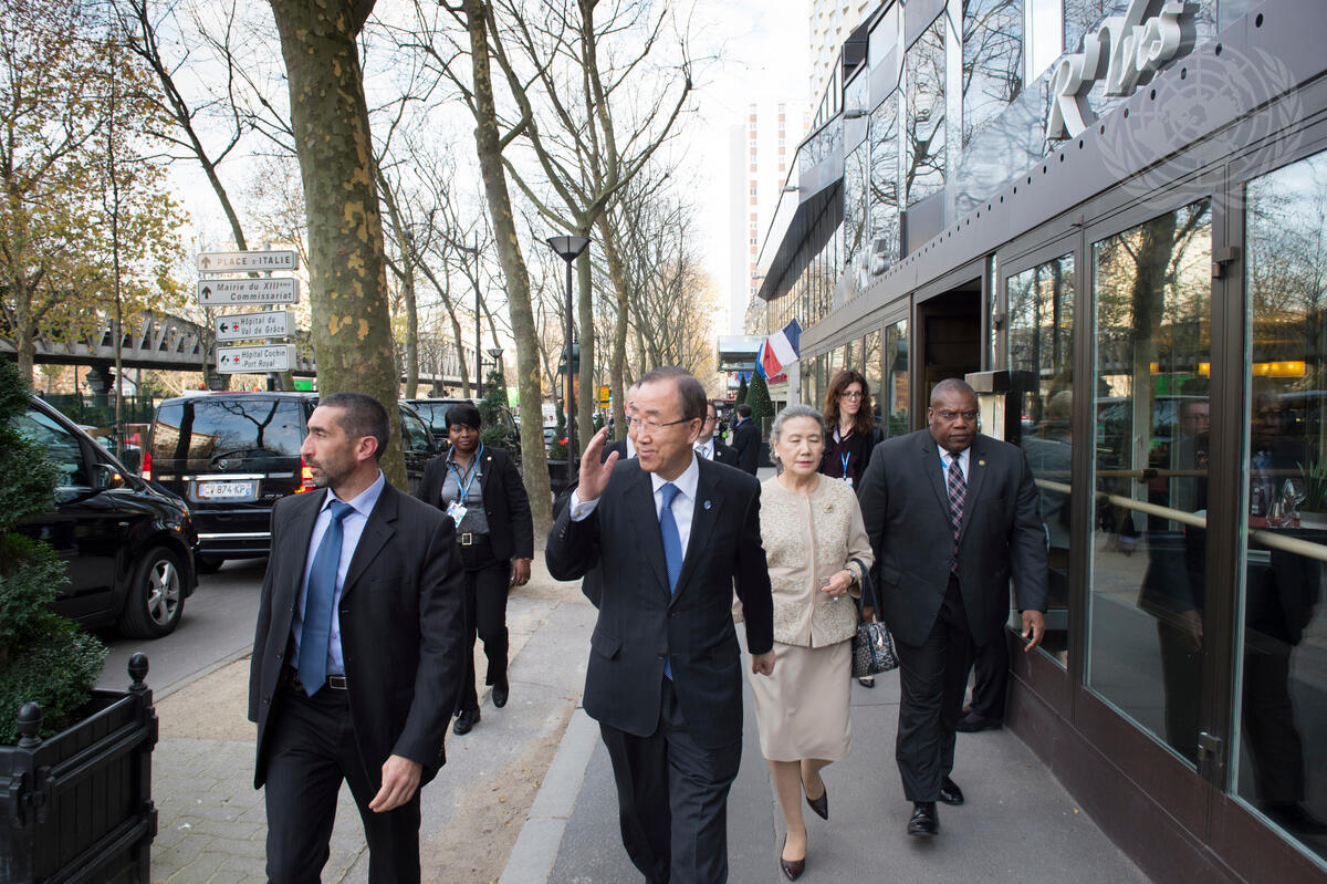 Secretary-General Ban Ki-moon (centre left) on his way to the Paris Agenda Council Day, hosted by the World Business Council for Sustainable Development (WBCSD), where he will deliver a keynote address. He is joined by his wife, Yoo Soon-taek (centre right).