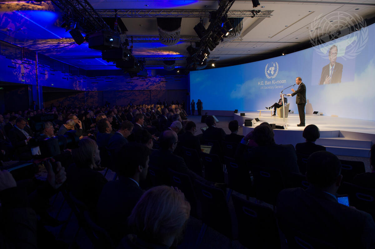 A view of the event as Secretary-General Ban Ki-moon (at podium) delivers the keynote address at the Paris Agenda Council Day, hosted by the World Business Council for Sustainable Development (WBCSD).