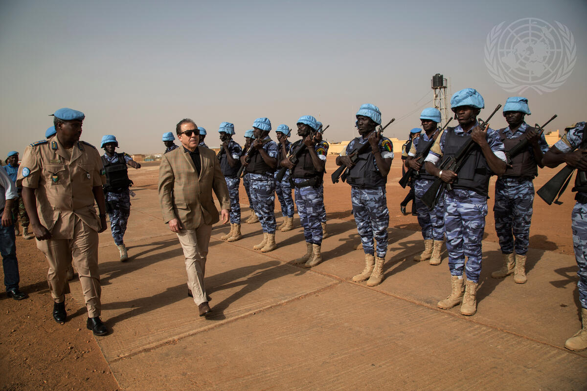 Mongi Hamdi (second from left), Special Representative of the Secretary-General and Head of the UN Multidimensional Integrated Stabilization Mission in Mali (MINUSMA), reviews the Senegalese peacekeepers during his visit to Gao.