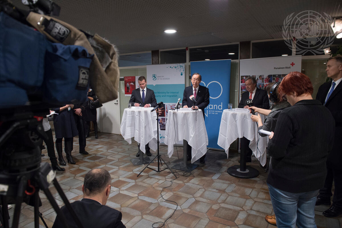 Secretary-General Ban Ki-moon (centre) addresses journalists during his visit to the Auramotalo asylum seekers’ reception centre in Vantaa, Finland. He is flanked by Petteri Orpo (left), Minister of the Interior of Finland; and António Guterres, UN High Commissioner for Refugees.