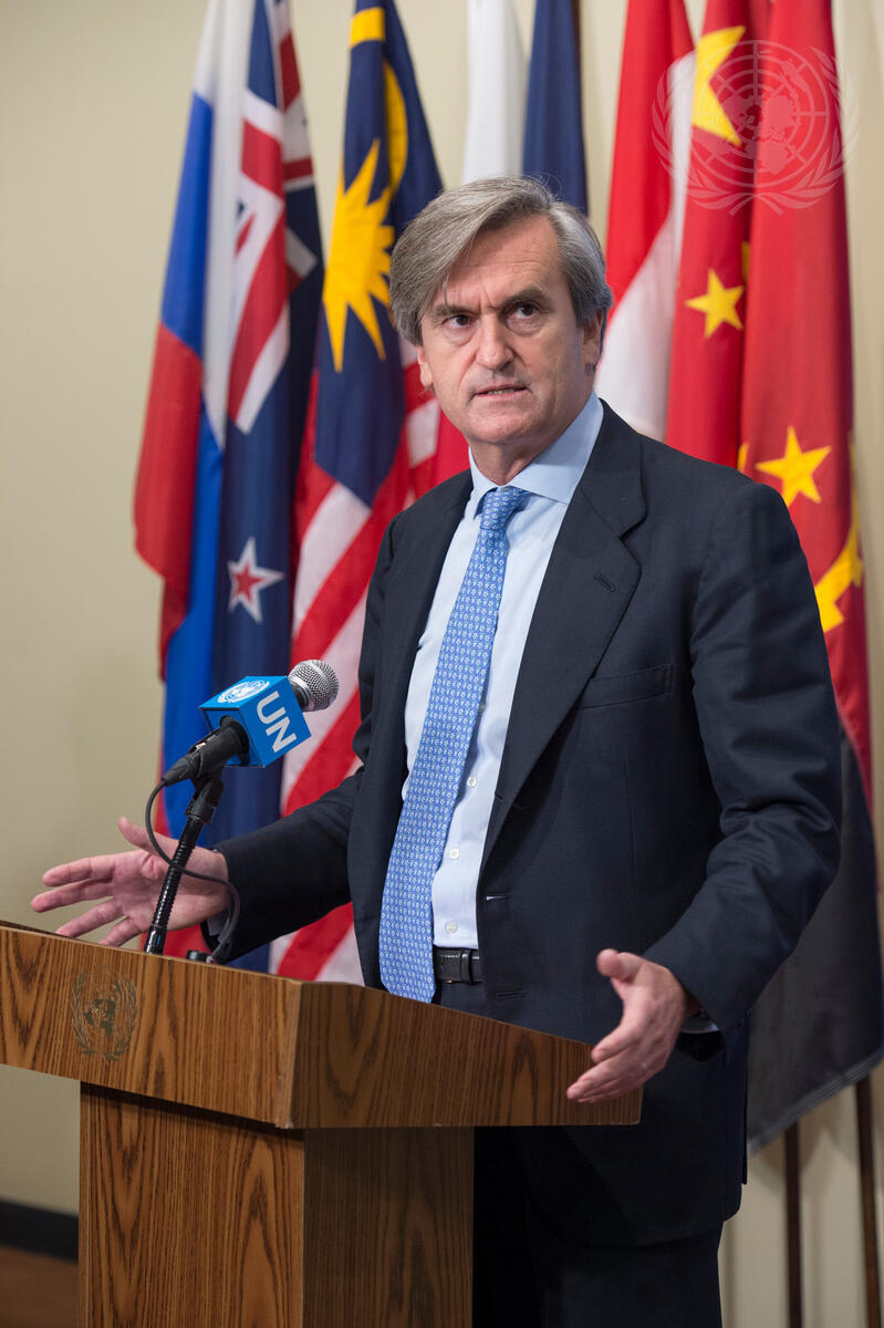 Román Oyarzun Marchesi, Permanent Representative of Spain to the United Nations, speaks to the press following today's Security Council meeting.