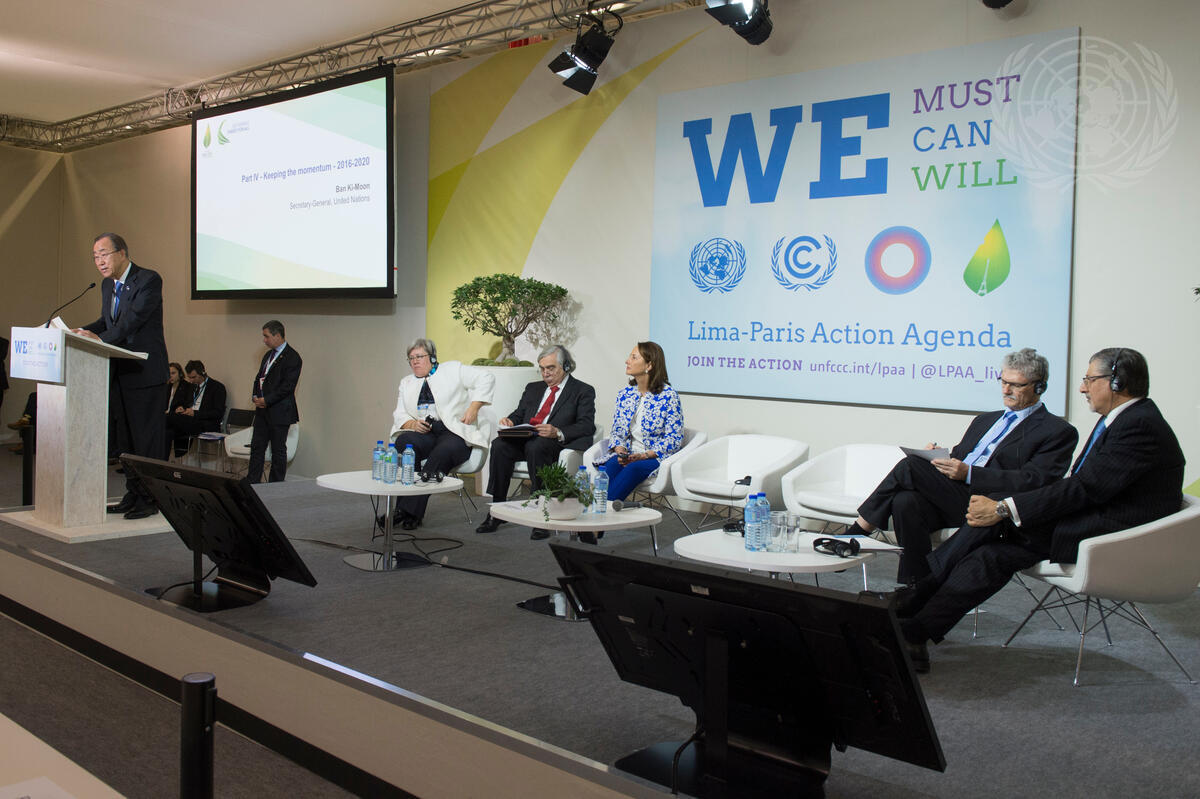 Secretary-General Ban Ki-moon (at lectern) addresses the closing of the Thematic Day on Energy during the UN Climate Change Conference in Paris (COP21). Also pictured, Mogens Lykketoft (second from right), President of the seventieth session of the General Assembly.