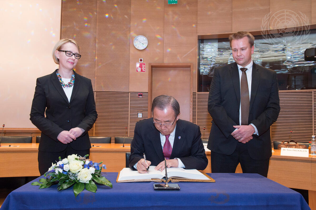 Secretary-General Ban Ki-moon (centre) meets with Maria Lohela (left), Speaker of the Parliament of Finland, and Antti Kaikkonen, Chairperson of the Parliament’s Foreign Affairs Committee.