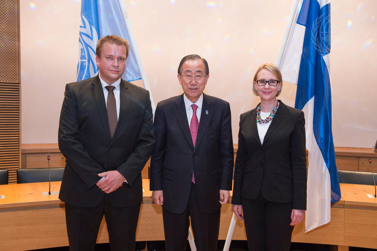 Secretary-General Ban Ki-moon (centre) meets with Maria Lohela (right), Speaker of the Parliament of Finland, and Antti Kaikkonen, Chairperson of the Parliament’s Foreign Affairs Committee.