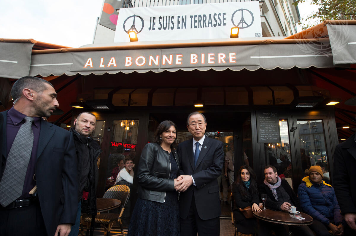Secretary-General Ban Ki-moon (fourth from left) and Anne Hidalgo (third from left), Mayor of Paris, visit Café La Bonne Bière to pay tribute to the victims of the 13 November terrorist attack, in Paris, France.