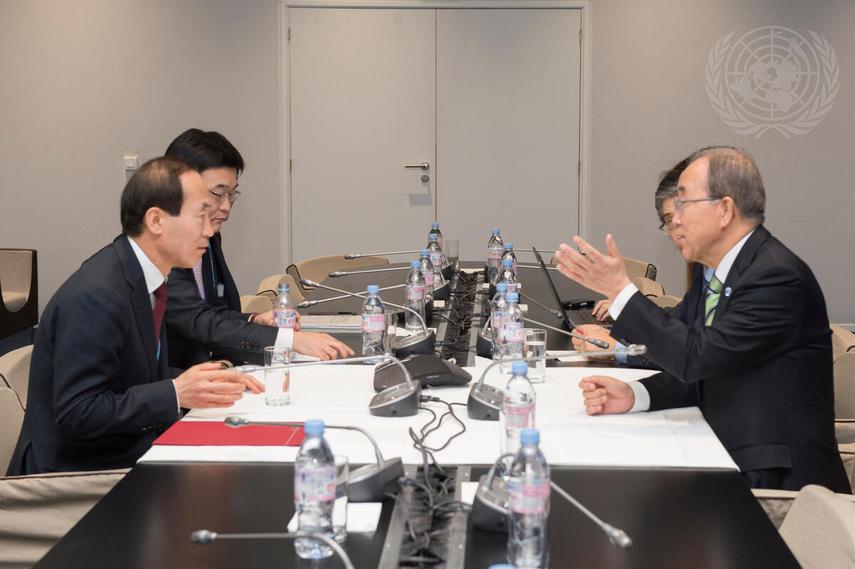 Secretary-General Ban Ki-moon (first on right, right side of table) meets with Yoon Seong-kyu (first on left, left side of table), Minister of the Environment of the Republic of Korea, at the UN Climate Change Conference (COP21) in Paris, France.