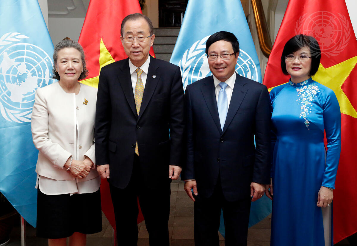 Secretary-General Ban Ki-moon (second from left) and his wife, Yoo Soon-taek (left), meet with Pham Binh Minh (second from right), Deputy Prime Minister and Minister for Foreign Affairs of the Socialist Republic of Viet Nam, and his wife.