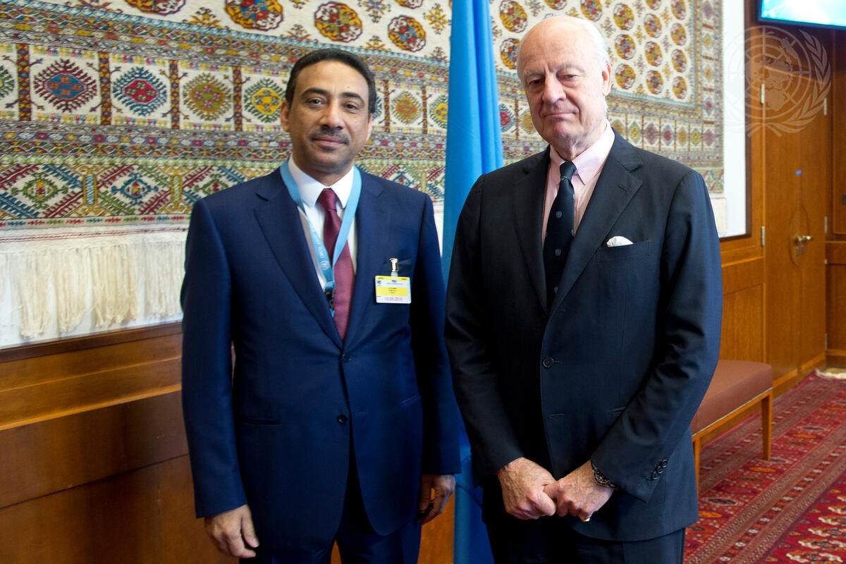 Staffan de Mistura, Special Envoy of the Secretary-General for Syria, met with a delegation of the Sultanate of Oman, led by Abdullah Nasser Al-Rahbi, Permanent Representative to the United Nations in Geneva, in the framework of the Geneva Consultations on Syria.