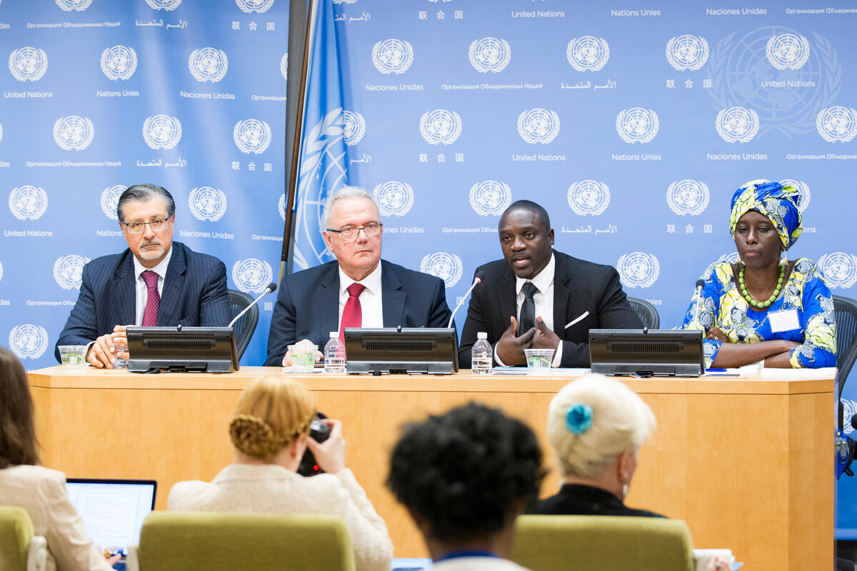 Akon (centre right), R&B artist and co-founder of Akon Lighting Africa, addresses a press conference on the topic,""Sustainable Energy for All: Actions and Commitments"".addresses a press conference on the topic, ""Sustainable Energy for All: Actions and Commitments"". Also briefing journalists with him were (from left): Adnan Amin, Director-General of the International Renewable Energy Agency (IRENA); Neven Mimica, European Commissioner for International Cooperation and Development; and Sheila Oparaocha, International Coordinator of ENERGIA (International Network on Gender and Sustainable Energy).