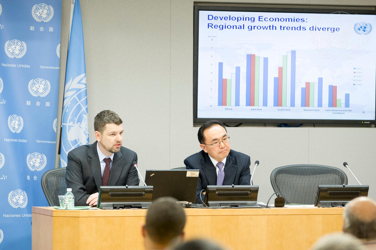 Ingo Pitterle (left), Economic Affairs Officer, UN Department of Economic and Social Affairs (DESA), briefs journalists on the launch of the World Economic Situation and Prospects 2015 mid-year report. Also addressing the press with him was Pingfan Hong, Director of the Development Policy and Analysis Division, DESA.