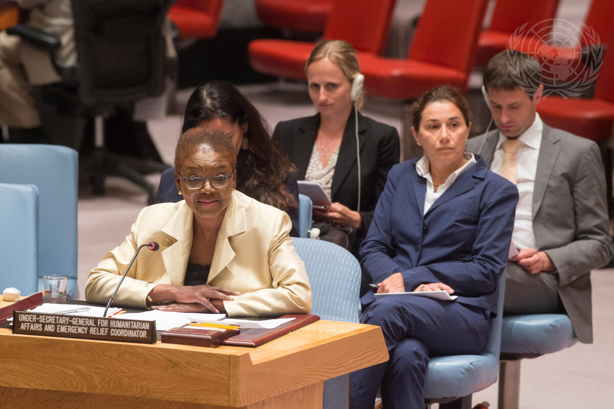 Valerie Amos, outgoing Under-Secretary-General for Humanitarian Affairs and Emergency Relief Coordinator, delivers her last briefing to the Security Council on the humanitarian situation related to the conflict in Syria.