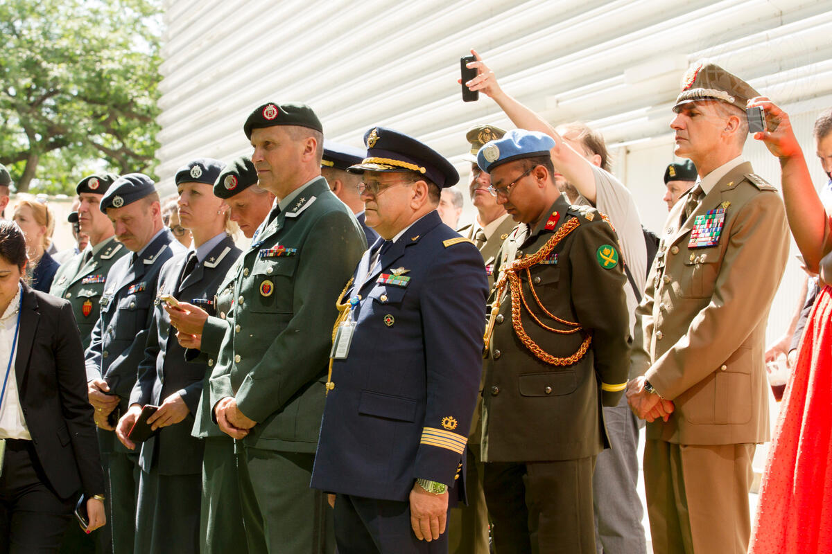 Participants during a wreath-laying ceremony on the occasion of the International Day of United Nations Peacekeepers (29 May).